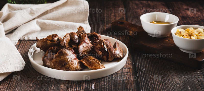 Кусочки жареной куриной печени на тарелке на столе веб-баннер