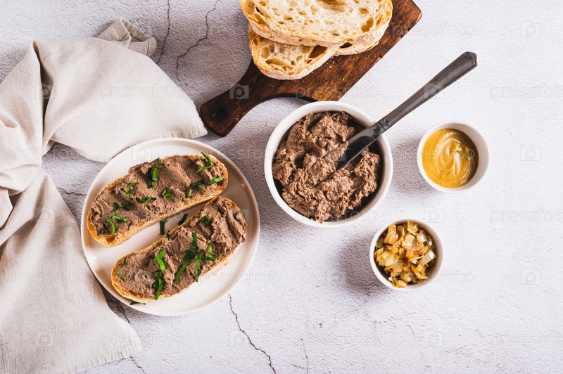 Бутерброды с паштетом из куриной печени и зеленью на тарелке на столешнице