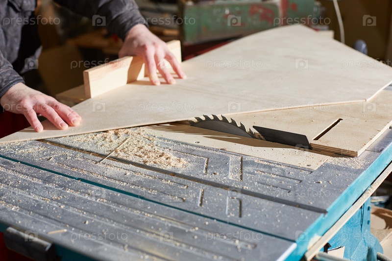 Руки рабочего режут фанеру на станке с дисковой пилой