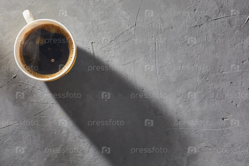 Чашка кофе с паром на сером бетонном фоне. вид сверху. минимализм