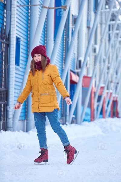 Девушка в яркой одежде катается на коньках по льду