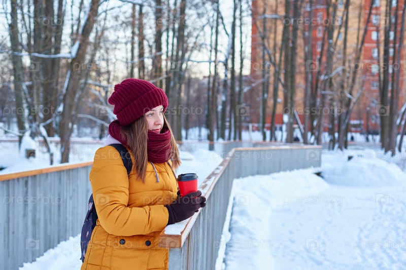 Молодая женщина гуляет по зимнему парку с чашкой кофе в руках