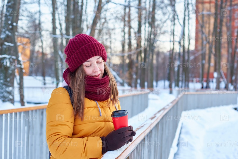 Молодая девушка гуляет по зимнему парку с чашкой кофе в руках