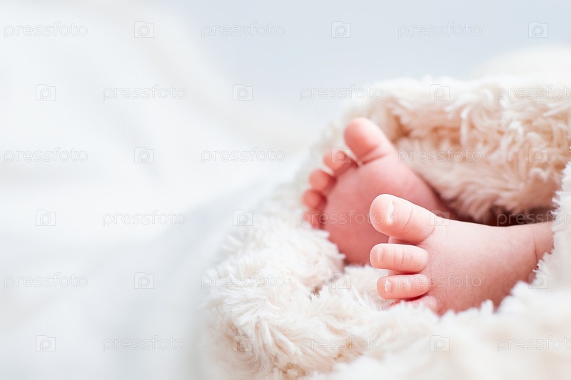 Маленькие детские ножки, завернутые в бежевую ткань. Место для текста. Детская открытка. Маленькая глубина резкости на фотографии