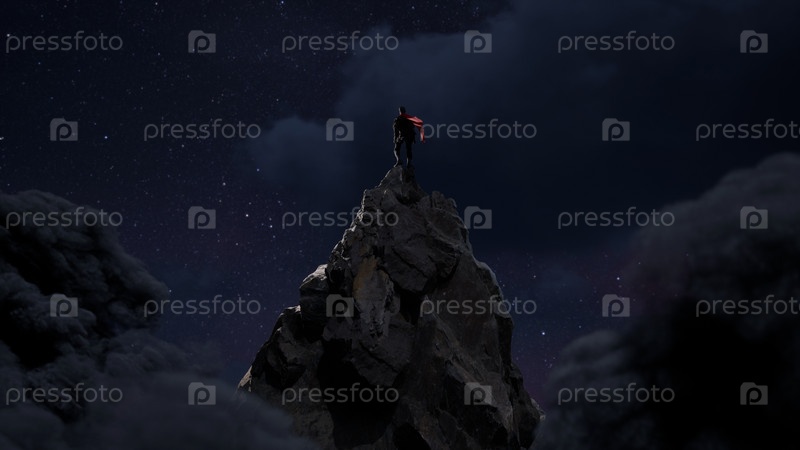 Подняться на вершину. Герой один на вершине скалы над облаками,