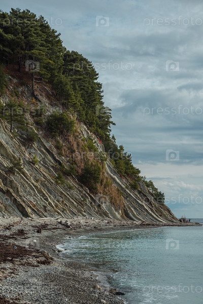 Изрезанная береговая линия с крутыми лесистыми скалами встречается с каменистым пляжем и спокойным морем под пасмурным небом. Дикая и красивая местность