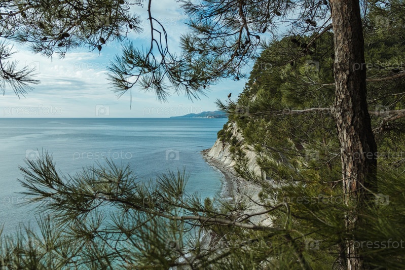 Безмятежный вид на побережье, обрамленное соснами, с утеса, ведущего к спокойному синему морю под частично облачным небом. Прекрасный вид на скалистое побережье