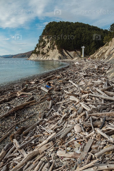 Каменистый берег, покрытый плавником и мусором, ведет к лесистому утесу с белым маяком. Море спокойно под частично облачным небом