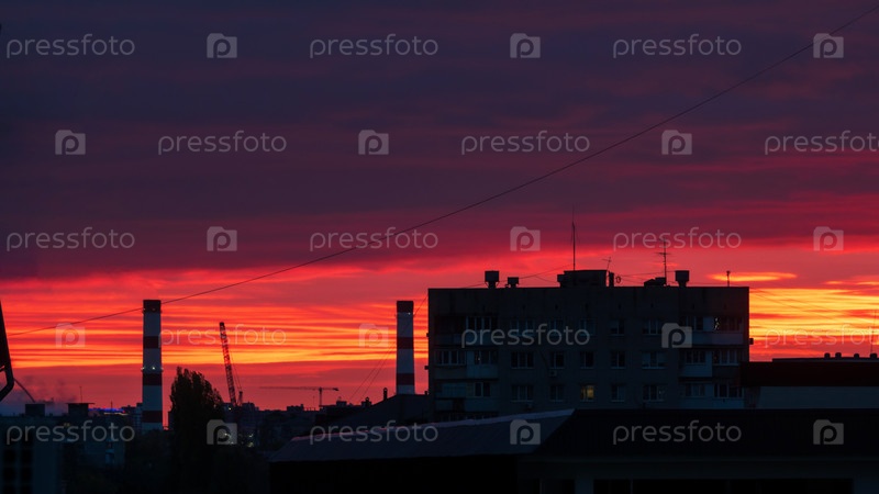 Городской закат. Драматическое закатное небо над городским пейзажем с силуэтами зданий и промышленных элементов на ярком фоне красных и оранжевых оттенков