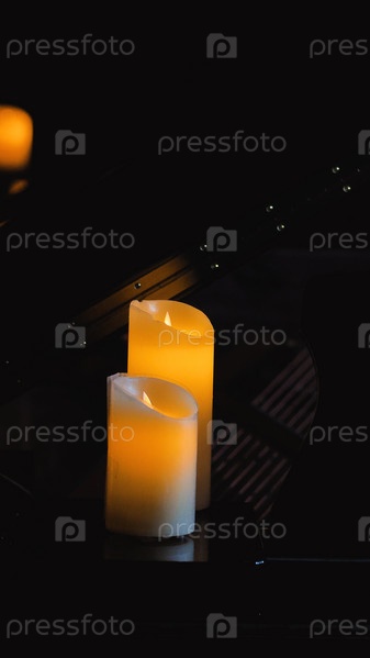 Две светодиодные свечи излучают теплый свет в темной комнате, создавая спокойную и интимную атмосферу. Свечи разной высоты располагаются на отражающей поверхности