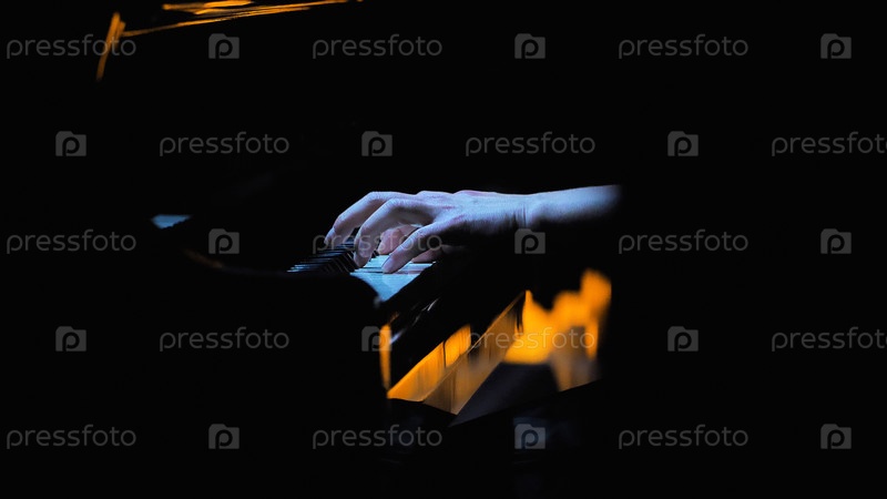 Крупный план рук человека, играющего на пианино. Низкое, мрачное освещение подчеркивает руки и клавиши пианино, создавая сфокусированный и драматический эффект на преимущественно темном фоне