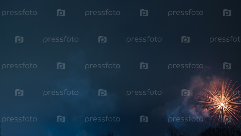 Одиночный фейерверк взрывается в ночном небе, отбрасывая красновато-оранжевые полосы на темно-синий фон