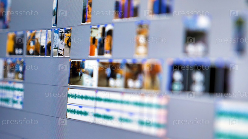 Крупный план, размытое изображение интерфейса программы для редактирования видео на экране компьютера. Фокус на временной шкале внизу, где небольшие миниатюры видеоклипов видны вдоль горизонтальной оси