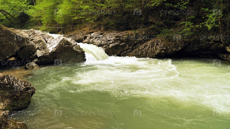 Небольшой водопад, ниспадающий между скалами, окруженными пышным лесом. Небольшие пороги дикой горной реки