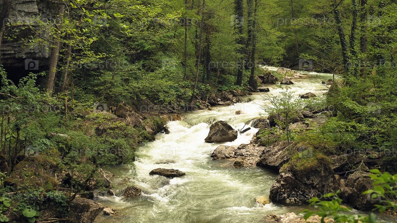 Бурная река, текущая через пышный зеленый лес с большими камнями и деревьями. Вид на извилистую горную реку