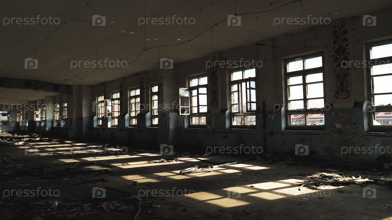 Заброшенное полуразрушенное здание с разбитыми окнами и разбросанным мусором. Солнечный свет проникает через окна, отбрасывая длинные тени на пол. Стены демонстрируют признаки распада и запустения