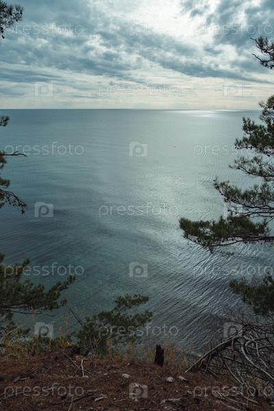 Безмятежный вид на спокойный океан под облачным небом, обрамленный соснами на краю скалы. Вода отражает приглушенный свет, создавая спокойную атмосферу