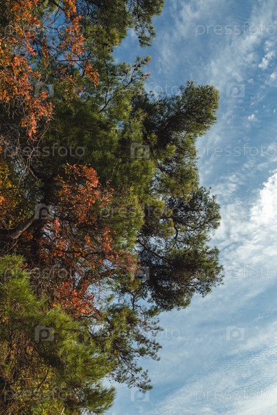 Высокие сосны с зелеными и оранжевыми листьями на фоне ярко-голубого неба с редкими облаками