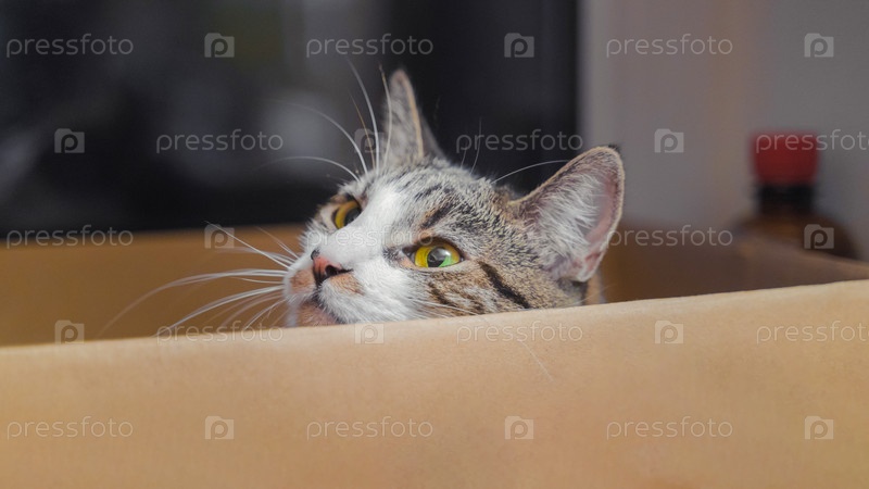 Молодая кошка чувствует себя комфортно в своей любимой коробке
