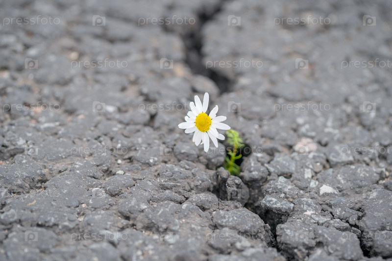 Прекрасная ромашка прорастает сквозь трещину в асфальте