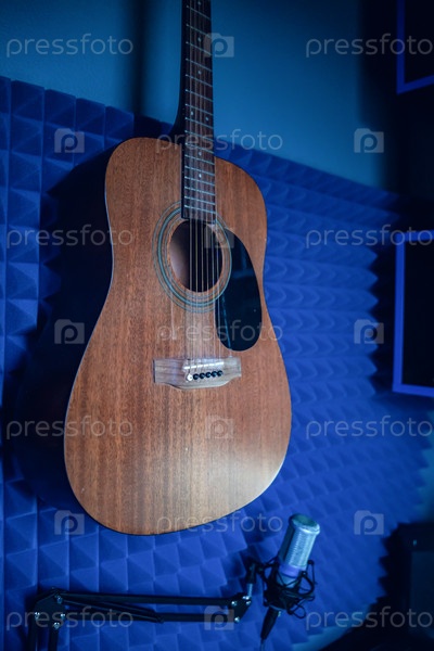 Акустическая гитара висит на стене в студии звукозаписи