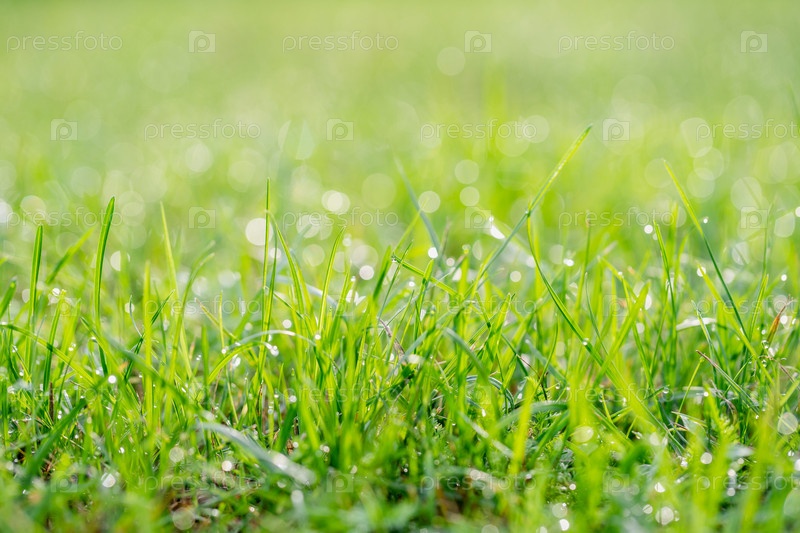 Зеленая трава с каплями росы под утренним солнцем, крупный план, размытый фон