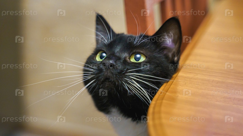 Кот выглядывает из-под стола и просит перекусить