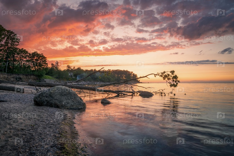 Чудесный оранжевый закат на скалистом берегу моря