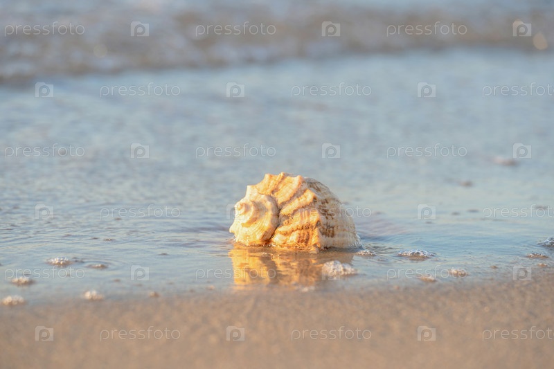 Красивая ракушка лежит на пляже, рядом с лазурной водой моря
