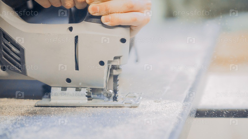 Плотник режет деревянную панель электроинструментом