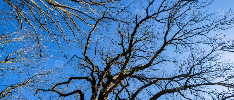 Ветви старых дубов, вид снизу, на фоне голубого неба