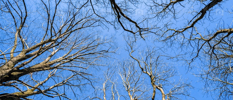 Ветви старых дубов, вид снизу, на фоне голубого неба