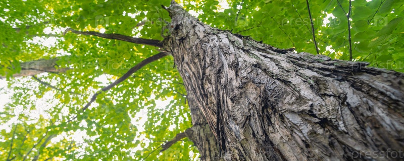 Большие деревья в лесу с пышной зеленой листвой, вид снизу