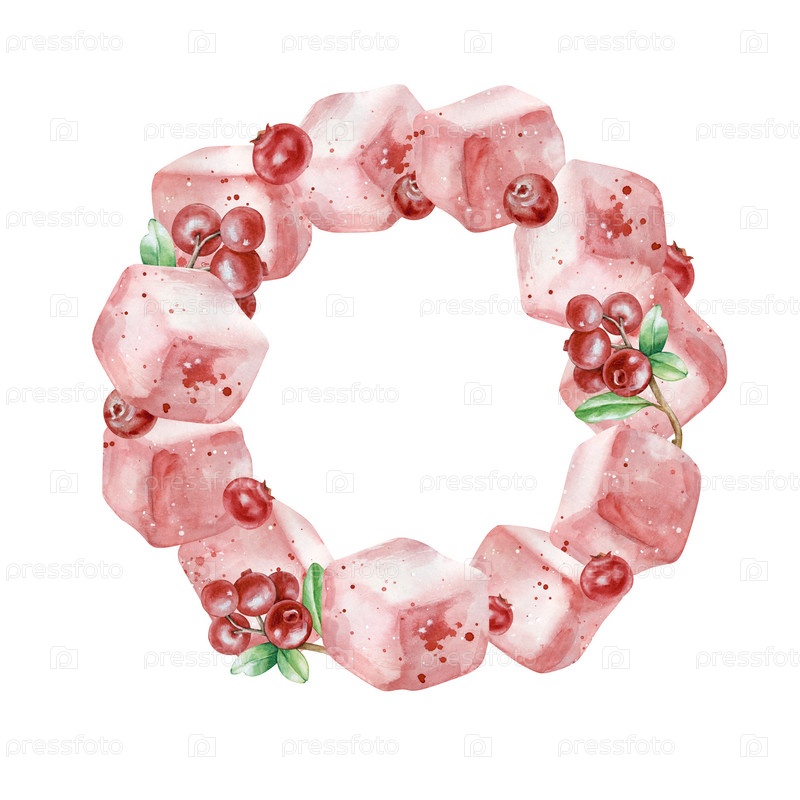 Акварельная круглая рамка из нарезанных кусочков ягодной пастилы и веточек клюквы расписана вручную. Вкусная розовая пастила с красными ягодами, веточками и зелеными листьями. Иллюстрация десерта изолирована на белом фоне. Место для вашей надписи. Для пов