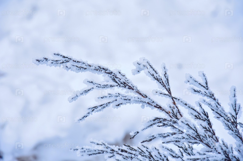 Красивая зимняя природа под снегом в инее ветви можжевельника, деревьев и кустов