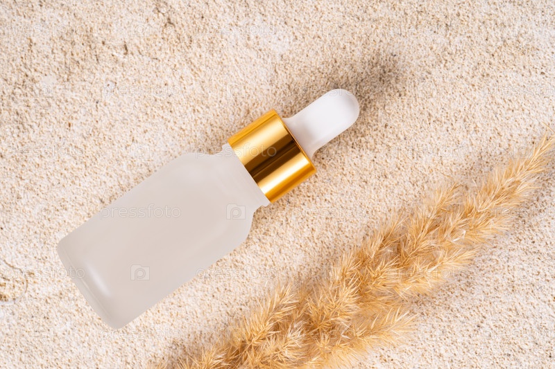 Минималистская концепция ухода за кожей с флаконом-капельницей сыворотки на каменном фоне. Презентация небрендированной упаковки ухода за кожей. Натуральная концепция