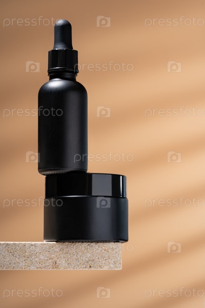Антивозрастная коллагеновая сыворотка для лица в матовой стеклянной бутылке и крем для лица на натуральной каменной полке на бежевом фоне с местом для копирования. Концепция натуральной органической косметики. Макет для брендинга