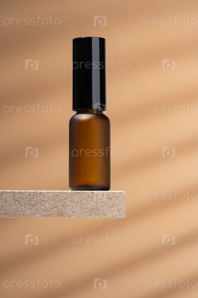 Бутылка из янтарного стекла с пустой этикеткой, крем на подставке из натурального камня на бежевом фоне. Макет натуральной органической спа-косметики. Минимальное эстетическое косметическое средство по уходу за кожей