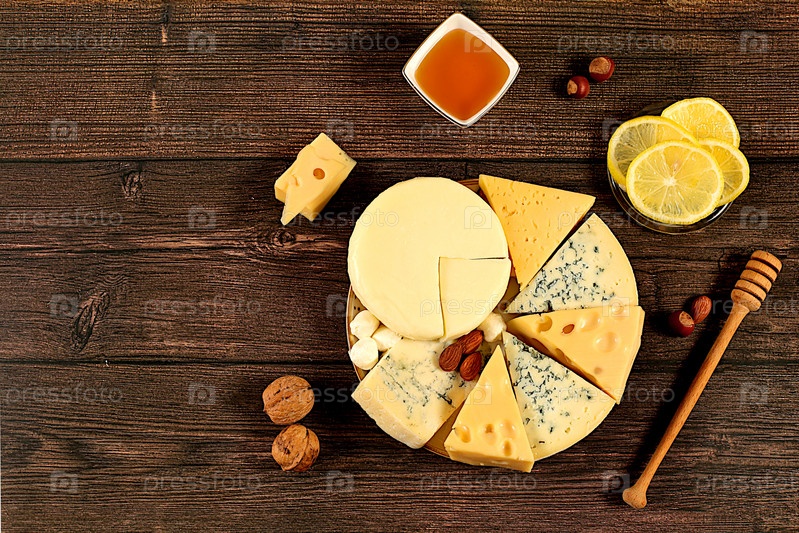 Ассортимент различных видов сыра, голубой сыр, горгонзола, рокфор, пармезан, моцарелла, маасдам с медом и орехами, выбор здоровой и натуральной пищи, рекламная карточка кафе и меню,