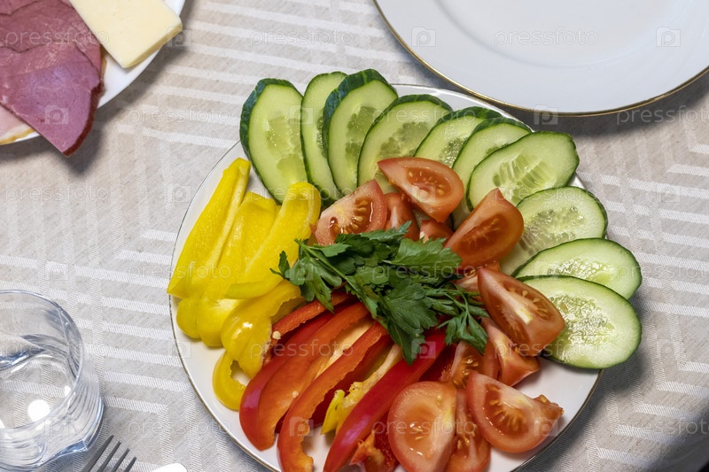 Фотография стола, накрытого разнообразными нарезанными свежими овощами, мясным ассорти, оливками, салатами. Праздник