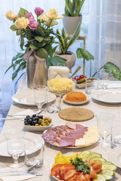 Фотография стола, накрытого разнообразными нарезанными свежими овощами, мясным ассорти, оливками, салатами. Праздник