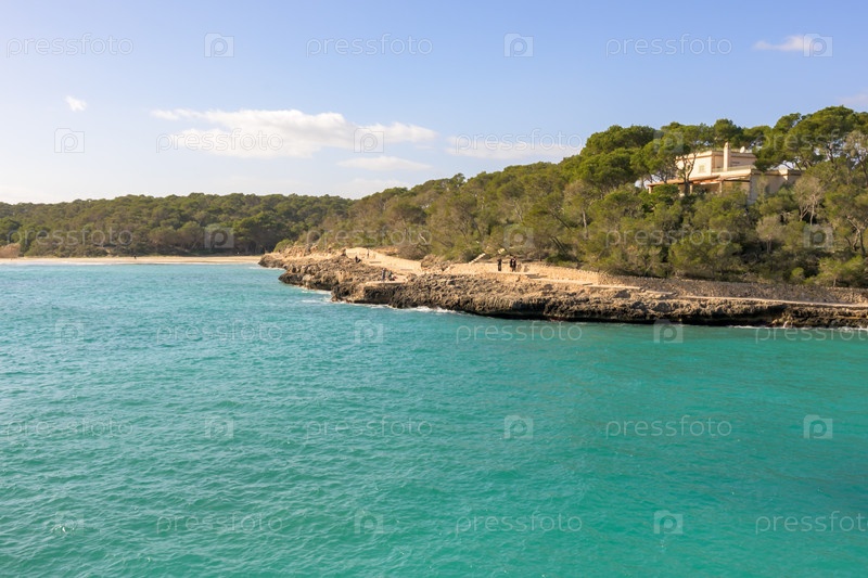 Прибрежный пейзаж с мысом, выступающим в бирюзовые воды под ясным небом, Кала Мондраго, Майорка, Балеарские острова, Испания,