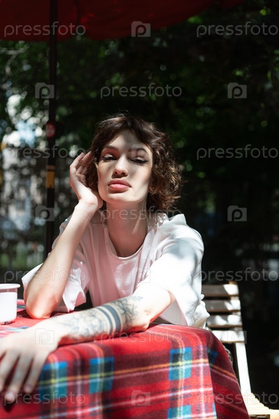 Молодая красивая женщина сидит за столом со скатертью летом