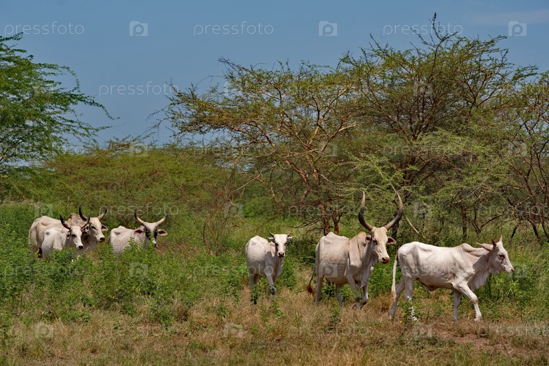 Западная Африка. Сенегал. Стадо коров Зебу с большими роскошными рогами возле небольшого озера идут на водопой