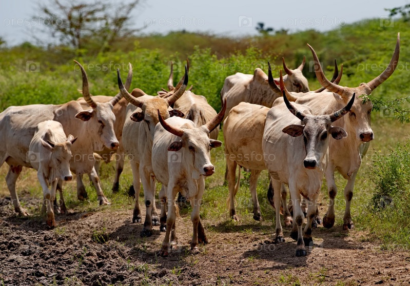 Западная Африка. Сенегал. Стадо коров Зебу с большими роскошными рогами возле небольшого озера идут на водопой
