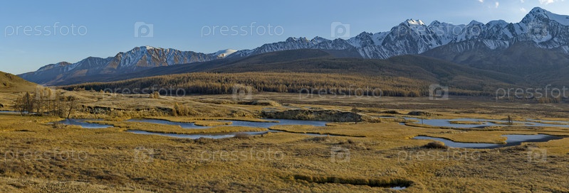 Россия. Юг Западной Сибири, горный Алтай. Вид на заболоченные проточные лабиринты озера Джангысколь, затерянное в Курайской степи у подножия Северо-Чуйского хребта