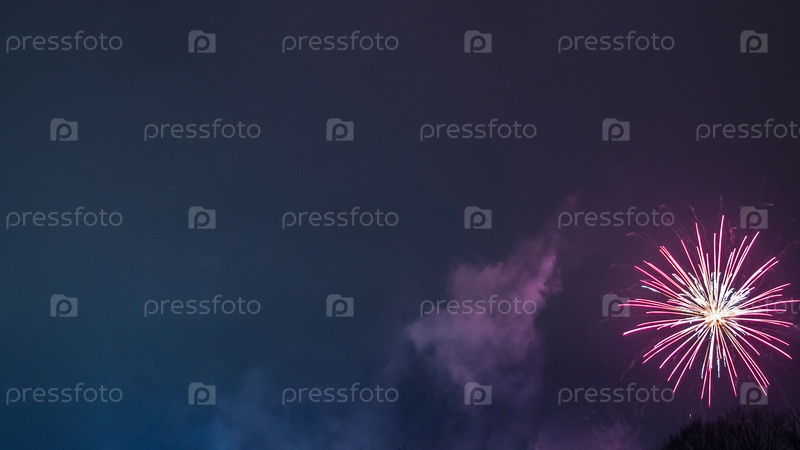 Одиночный фейерверк, который взрывается в ночном небе. Фейерверки с белой сердцевиной и розовыми полосами создают эффект звездообразования. Дымовой след указывает путь фейерверка, добавляя зрелищности моменту