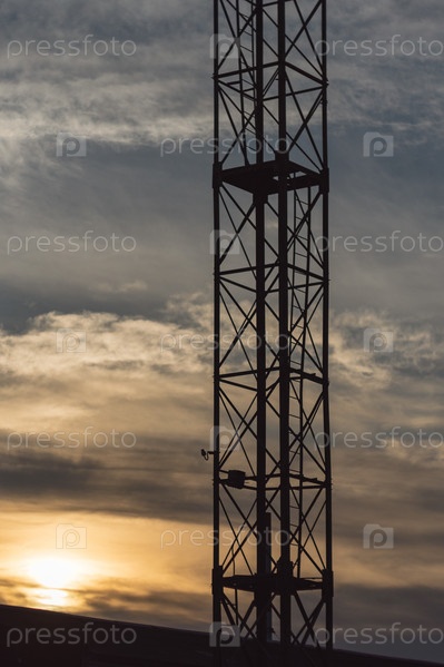Силуэт металлической башни на фоне пасмурного неба во время восхода солнца. Теплые тона солнца подчеркивают очертания конструкции, создавая драматичную и угрюмую атмосферу