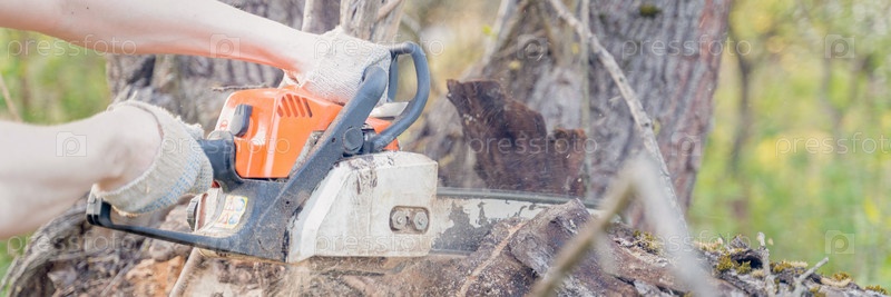 Фермер пилит дерево бензопилой, выборочная фокусировка, фокус на переднем плане, размытый фон