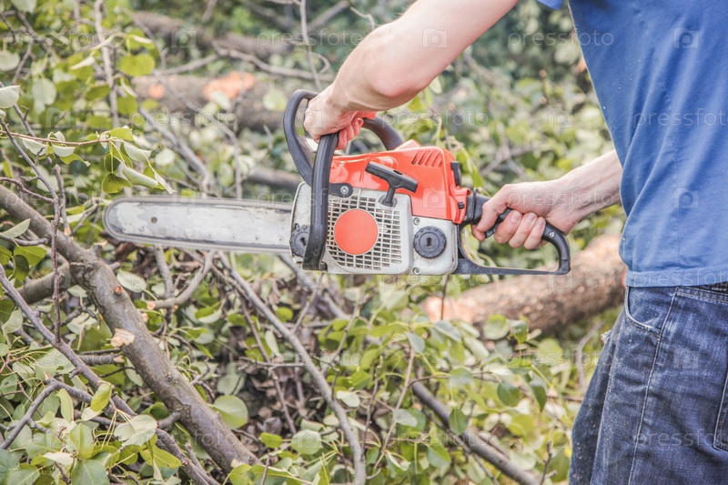 Мужчина с бензопилой пилит дерево, упавшее после урагана
